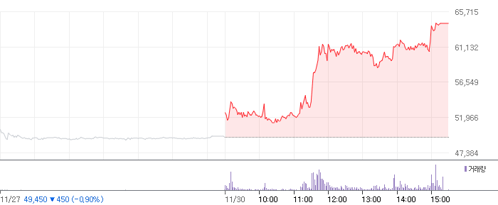 <삼성전자 2020.11.30 기준(장마감) 기준 당일 주식 차트>