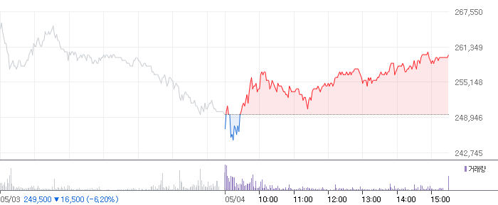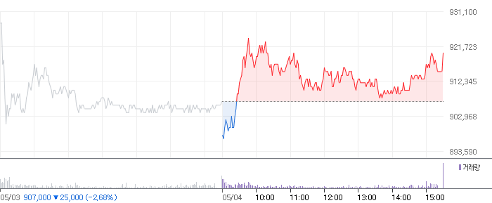 <LG화학 2021.05.04 기준(장마감) 기준 당일 주식 차트>