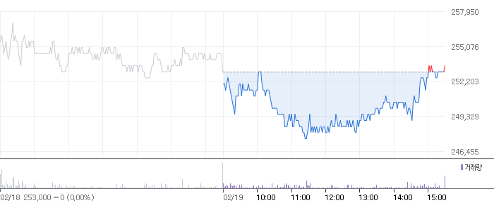<SK텔레콤 2021.02.19 기준(장마감) 기준 당일 주식 차트>