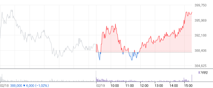 <카카오 2021.02.19 기준(장마감) 기준 당일 주식 차트>