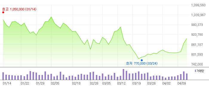 아래는 LG화학의 일간, 3개월 주식 변동 차트입니다.